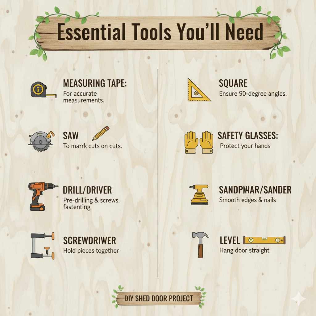 Don’t worry if you don’t have a professional workshop! You can build a great shed door with a few common tools. Having the right tools makes the job easier, safer, and results in a much better finish. Here’s a list of what you’ll likely need: